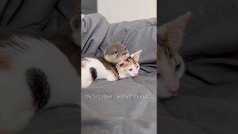 When baby otter meets kitten🦦🐈🥰 #yoonathetigerdachshund #dog #puppy #shorts